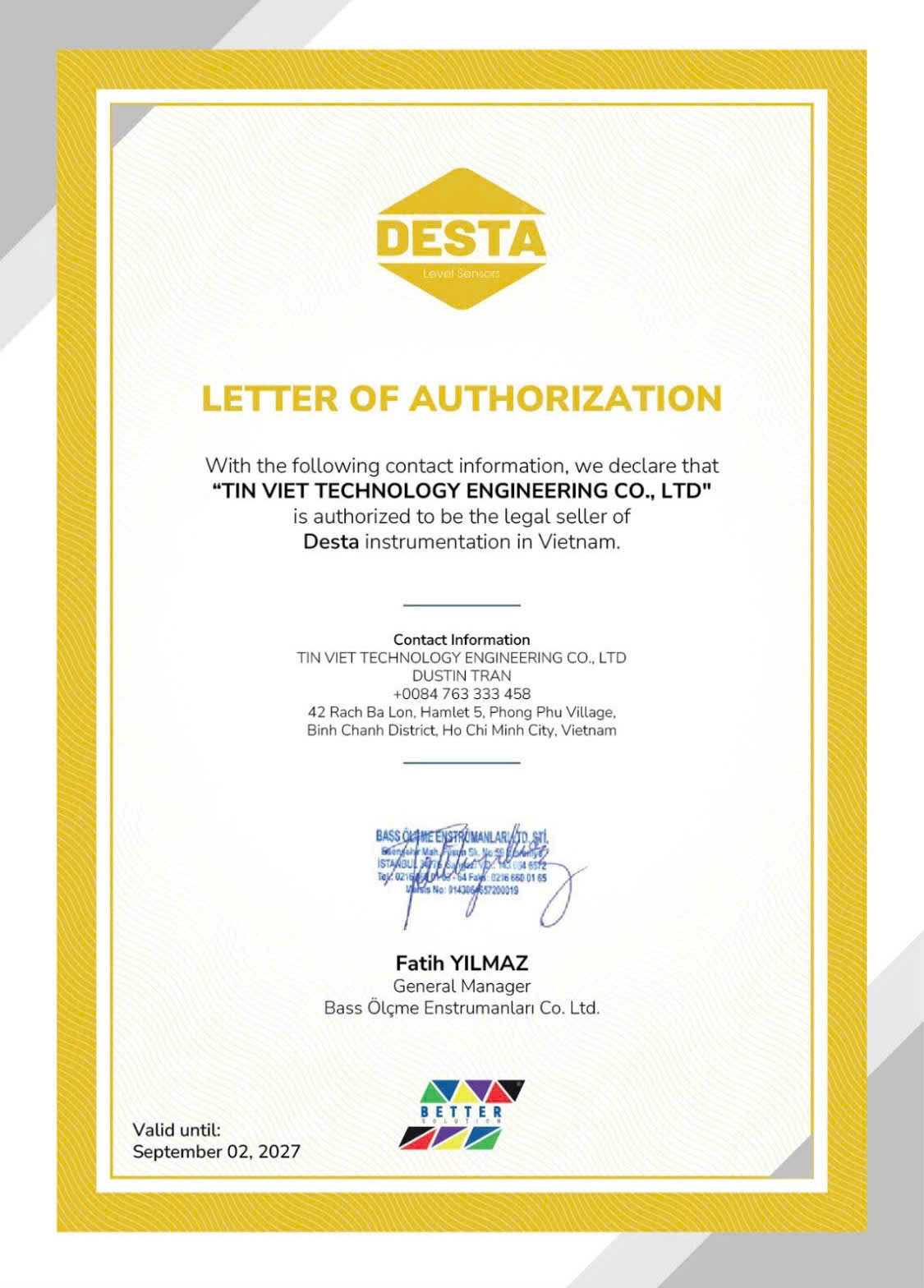Tín Việt là đơn vị phân phối chính hãng các thiết bị của Desta tại Việt Nam. Do vậy, các thiết bị của chúng tôi luôn có đầy đủ các chứng từ, CO, CQ, Test report… đảm bảo luôn có nguồn gốc rõ ràng. Ngoài ra, Tín Việt luôn có chế độ bảo hành rất rõ ràng cho các thiết bị điện, cũng như với cảm biến báo đầy báo cạn chống bám dính. Do vậy, quý khách hàng hoàn toàn có thể yên tâm về các dịch vụ hậu mãi của chúng tôi.